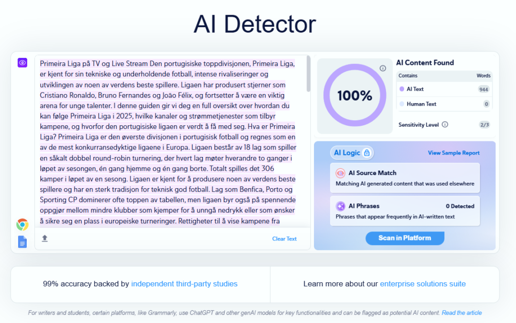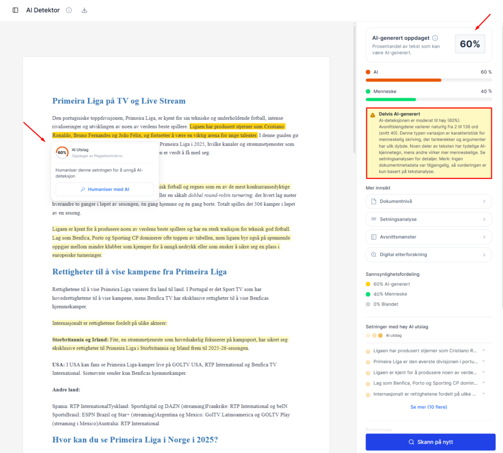 Plattformen fremhever også en norsktrent AI-detektor – altså ikke bare en generisk «språkmodell-detektor» som er limt på et norsk grensesnitt. I en tid der både studenter, journalister og innholdsprodusenter blir møtt med mistanke basert på automatiske flagg, er det verdifullt å kunne kjøre teksten gjennom noe som er kalibrert for norsk tekst og norske falske positiver/negativer.