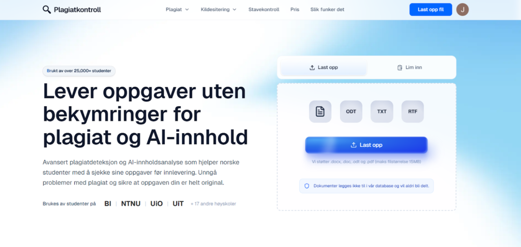 Plagiatkontroll.no er etter min erfaring det sterkeste valget for norske brukere som vil ta plagiat og KI-spor på alvor uten å måtte «oversette» resultatene fra et rent engelskspråklig system. Plattformen er bygget med norske behov i tankene: fra blogginnlegg og oppgaver til fagtekster der kilder og originalitet faktisk betyr noe juridisk og faglig.